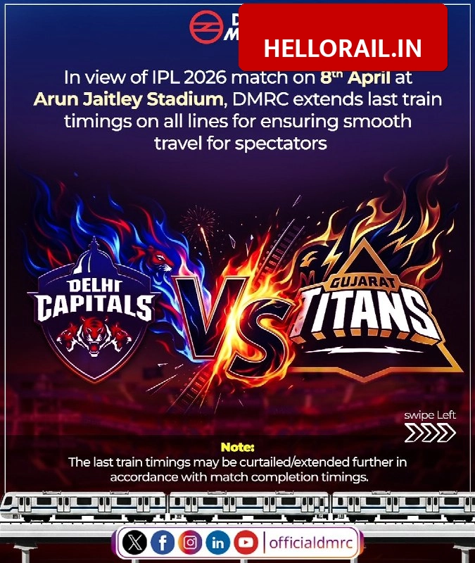 The Delhi Metro Rail Corporation (DMRC) decided to extend its last train timings on all lines for the upcoming IPL match on April 8, 2026. The match will be played at the Arun Jaitley Stadium between Delhi Capitals and Gujarat Titans. This step ensures that cricket fans can enjoy the game and reach home safely using public transport after the match concludes late in the evening.