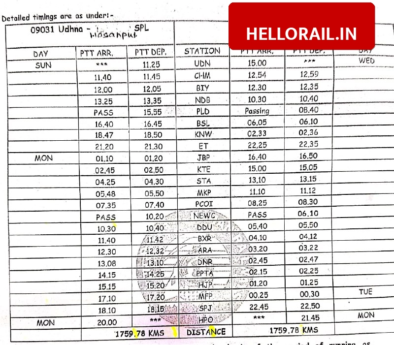 | 09031 | Udhna Jn to Hasanpur Road | Sunday Only | 11:25 hrs | 20:00 hrs (Next Day) |