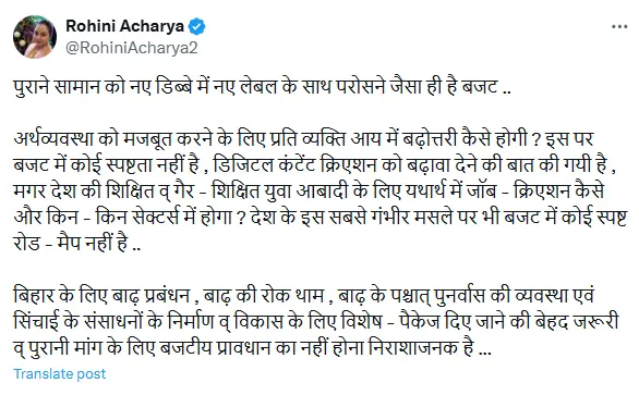 - Rohini Acharya expressed disappointment over the absence of provisions for flood management and rehabilitation.