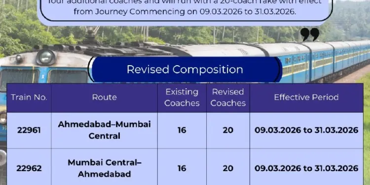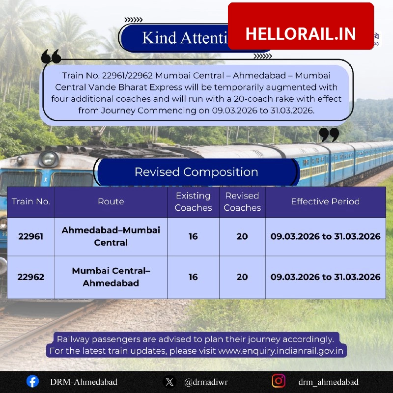 According to the latest update from Western Railway, the augmentation applies to the Mumbai Central – Ahmedabad Vande Bharat Express. Specifically, Train No. 22961 (Mumbai Central to Ahmedabad) and Train No. 22962 (Ahmedabad to Mumbai Central) will now operate with a longer rake. The train, which usually runs with 16 coaches, will now run with 20 coaches.